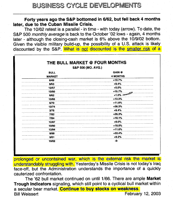 February 12, 2003 – “Buy” SARS and the 2003 Iraq Invasion interrupted the October ’02 bull market. Eighteen days after this report the S&P bottomed slightly above the 10/2/02 low and climbed +45%!