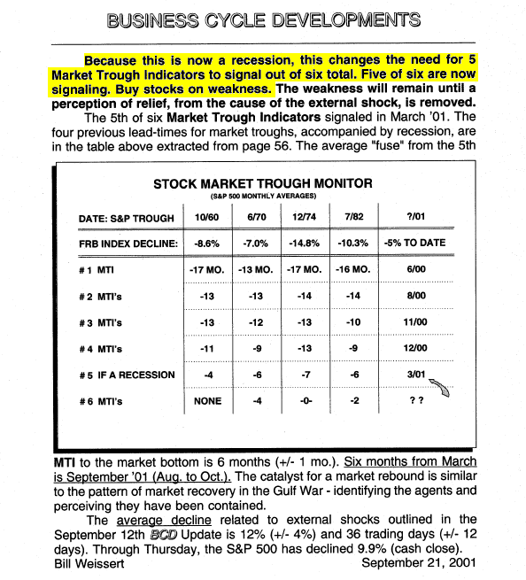 September 21, 2001 – “Buy” This timed the very bottom in the S&P related to the 911 attack! – subsequent gain +21% to March 2002.