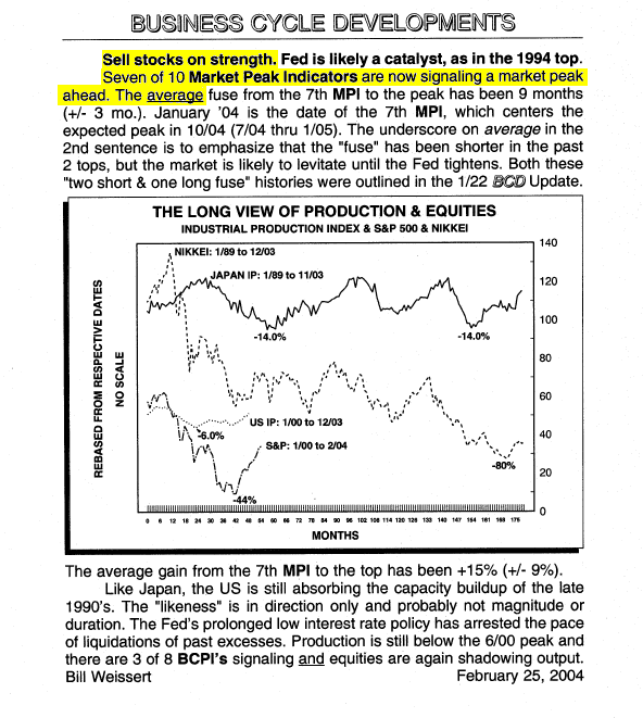 February 25, 2004 – “Sell” This “sell” passed up the S&P peak by nine days and 1.6%. The following decline was two tiered, as the S&P fell -8% and the Nasdaq dropped -19%.