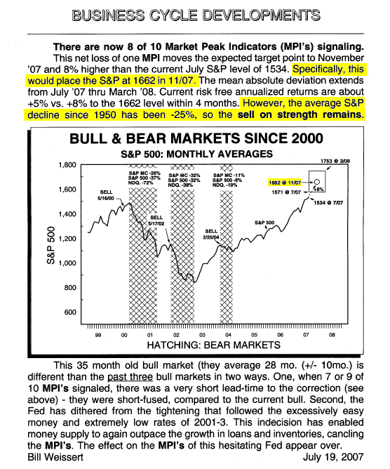 July 19, 2007 – “Sell” Expected the S&P to peak between July and November 2007 at a monthly average between 1534 and 1662 – the peak was in October 2007 at 1540. The decline was -57%!